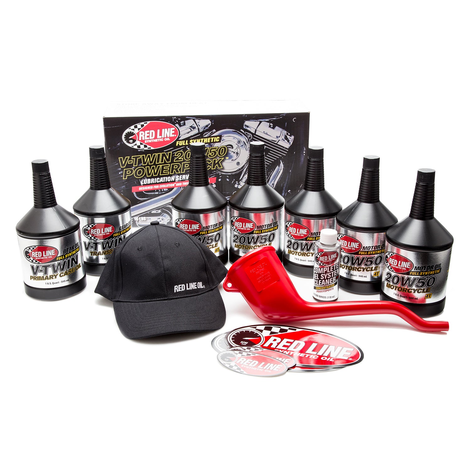 - Includes 5 quarts of 20W50 Motorcycle Oil, 1 quart of V-Twin Transmission Oil with ShockProof, 1 quart of Primary Chain Case Oil, 1 bottle of Fuel Injection Cleaner for Powersports, a sticker kit, a Red Line Oil embroidered hat and a versatile funnel